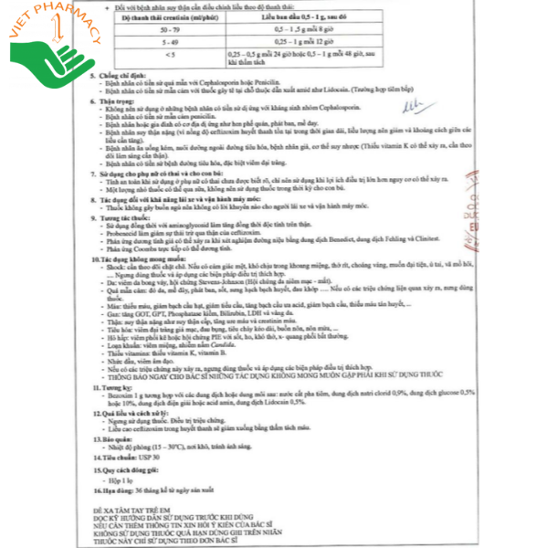 - Không nên sử dụng ở những bệnh nhân có tiền sử dị ứng với kháng sinh nhóm Cephalosporin.