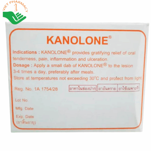 Thuốc Kanolone có hoạt chất là triamcinolone acetonide, đây là một corticosteroid được tổng hợp được dùng điều trị tại chỗ những vết loét. Triamcinolone có tác dụng chống viêm, chống dị ứng, ức chế miễn dịch. Hoạt chất này khi sử dụng tại chỗ có tác dụng ngăn chặn, giảm các triệu chứng do viêm gây ra như nóng rát, phồng rộp. Thuốc được hấp thu tốt khi dùng tại chỗ, ở các vết thương vết loét.