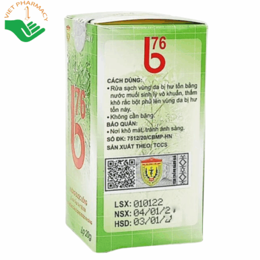 - Đối với thuốc bỏng B76 người sử dụng sẽ dùng sản phẩm bằng cách rắc trực tiếp lên các vết thương đã nêu trên từ 1 đến 2 lần mỗi ngày tùy theo độ lớn và mức độ nghiêm trọng của vết thương.