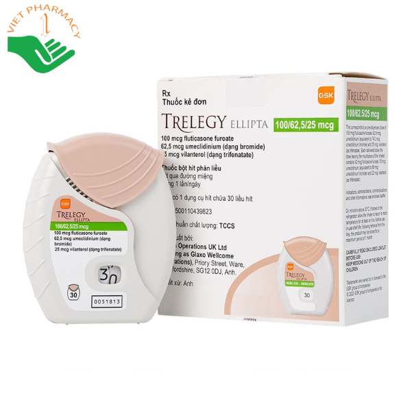 – Thận trọng khi sử dụngĐợt kịch phát: Trelegy Ellipta không nên được sử dụng để điều trị đợt kịch phát cấp tính COPD mà cần được điều trị bằng thuốc giãn phế quản tác dụng ngắn. Việc gia tăng sử dụng các thuốc giãn phế quản tác dụng ngắn để làm giảm các triệu chứng cho thấy tình trạng kiểm soát bệnh đang xấu đi và bệnh nhân nên đến bác sĩ để kiểm tra. Bệnh nhân không nên ngừng điều trị với Trelegy Ellipta mà không có sự giám sát của bác sĩ do các triệu chứng có thể tái phát sau khi ngừng thuốc. Co thắt phế quản nghịch lý: Cũng như các liệu pháp đường hit khác, co thắt phế quản nghịch lý có thể xảy ra kèm theo tăng ngay lập tức khô khê sau dùng thuốc và có thể đe dọa tính mạng bệnh nhân. Nên ngừng điều trị bằng Trelegy Ellipta ngay, bệnh nhân nên được đánh giá và dùng các liệu pháp thay thế nếu cần. Các tác động trên tim mạch: Các tác động trên tim mạch, ví dụ loạn nhịp tim như rung nhĩ và nhịp tim nhanh, có thể thấy sau khi dùng các thuốc đối kháng thụ thể muscarinic hoặc các thuốc kích thích thần kinh giao cảm, bao gồm lần lượt là umeclidinium hoặc vilanterol. Do đó, Trelegy Ellipta nên được dùng thận trọng cho các bệnh nhân có bệnh lý tim mạch không ổn định hoặc đe dọa tính mạng. Bệnh nhân suy gan: Các bệnh nhân suy gan trung binh đến nặng đang điều trị bằng Trelegy Ellipta 100/62,5/25 mog nên được theo dõi các phản ứng bất lợi toàn thân liên quan đến corticosteroid (xem Liều lượng và cách dùng). Tác động toàn nhân của corticosteroid: Các tác động toàn thân có thể xảy ra với bất kỳ corticosteroid dạng hút nào, đặc biệt khi dùng liều cao trong thời gian dài. Các tác động này xảy ra ít hơn rất nhiều so với corticosteroid đường uống. Các tác động toàn thân có thể gồm: ức chế trục hạ đồi – tuyến yên – thượng thận, làm giảm mật độ khoảng của xương, đục thủy tinh thể, tăng nhãn áp và bệnh hắc võng mạc trung tâm thanh dịch (central serious chorioretinopathy – CSCR). Cũng như tất cả các thuốc chứa corticosteroid, Trelegy Ellipta nên được sử dụng thận trọng ở các bệnh nhân bị lao phổi, hoặc các bệnh nhân bị nhiễm khuẩn mạn tính hoặc nhiễm khuẩn chưa được điều trị. Hoạt tinh không muscarinic: Do hoạt tính kháng muscarinic của thuốc, Trelegy Ellipta nên được SỬ dụng thận trọng cho các bệnh nhân bị bệnh glôcôm góc đóng hoặc bí tiểu. Viêm phổi: Tương tự như tác dụng chung đã biết của nhóm thuốc corticosteroid dạng hít, biến cố viêm phổi (bao gồm cả viêm phổi dẫn đến nhập viện) đã được quan sát thấy ở các bệnh nhân COPD sử dụng Trelegy Ellipta. Trong một số trường hợp, từ vong do viêm phổi đã được báo cáo khi sử dụng các thuốc chữa fluticasone furoate – corticoid dạng hít, trong đó có Trelegy Ellipta (Xem Tác dụng không mong muốn). Bác sĩ nên tiếp tục cảnh giác về khả năng tiến triển của viêm phổi trên những bệnh nhân COPD, vì các đặc điểm lâm sàng của viêm phổi trùng lặp với các dấu hiệu của đợt kịch phát COPD. Các yếu tố nguy cơ của viêm phổi ở những bệnh nhân COPD có sử dụng thuốc chứa corticosteroid dạng hít bao gồm những người đang hút thuốc, những bệnh nhân có tiền sử viêm phổi, bệnh nhân có chỉ số khối cơ thể thấp và bệnh nhân mắc COPD nặng. Những yếu tố này cần được xem xét khi kê đơn Trelegy Ellipta và cần đánh giá lại việc điều trị khi viêm phổi xảy ra. Tả được: Nếu được bác sĩ thông báo rằng bạn bị rối loạn dung nạp với một số loại đường, liên hệ với bác sĩ trước khi sử dụng thuốc này. Trelegy Ellipta có chứa lactose, không nên sử dụng thuốc này cho bệnh nhân mắc rối loạn di truyền hiếm gặp về dung nạp galactose như thiếu hụt men lactase, rối loạn hấp thu glucose-galactose. – Thai kỳ và cho con búKhả năng sinh sản: Không có dữ liệu về tác động của Trelegy Ellipta lên khả năng sinh sản ở người. Các nghiên cứu trên động vật cho thấy không có sự ảnh hưởng đến khả năng sinh sản của con đực và con cái. Thai kỳ: Chưa có đủ dữ liệu về việc sử dụng Trelegy Ellipta ở phụ nữ mang thai. Các nghiên cứu trên động vật cho thấy độc tính trên cơ quan sinh sản xảy ra sau khi dùng các chất chủ vận beta, hoặc corticosteroid (xem Dữ liệu an toàn tiền lâm sàng). Trelegy Ellipta chỉ nên được sử dụng trong thai kỳ nếu lợi ích cho người mẹ vượt trội bất kỳ nguy cơ nào có thể xảy ra với thai nhi. Cho con bú: Chưa biết liệu fluticasone furoate, umeclidinium, vilanterol hoặc các sản phẩm chuyển hóa của chúng có được bài tiết qua sữa mẹ hay không. Tuy nhiên, các corticosteroid, các chất đối kháng muscarinic và các chất chủ vận beta, khác đã được phát hiện trong sữa mẹ. Nguy cơ đối với trẻ sơ sinh/trẻ nhỏ bú sữa mẹ không thể được loại trừ. Cần cân nhắc ngừng cho trẻ bú mẹ hay ngừng liệu pháp Trelegy Ellipta dựa trên lợi ích của việc bú sữa mẹ đối với trẻ và lợi ích điều trị đối vớ