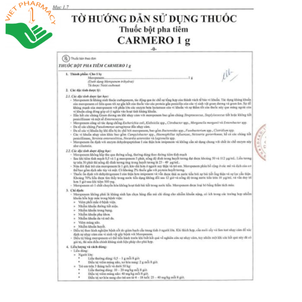 - Điều trị viêm màng não, xơ hóa nang: 2 lọ Carmero 1g mỗi 8 giờ.