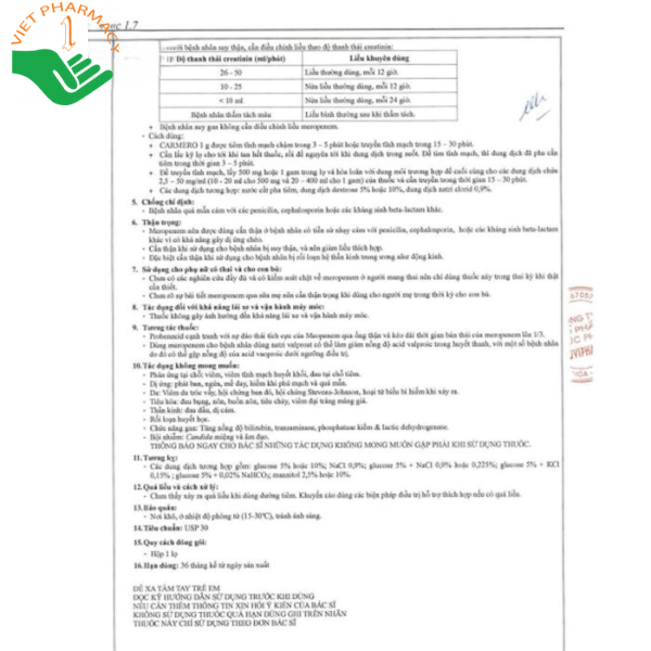 - Đánh giá tình trạng suy thận và hiệu chỉnh liều thuốc Carmero phù hợp cho từng bệnh nhân.