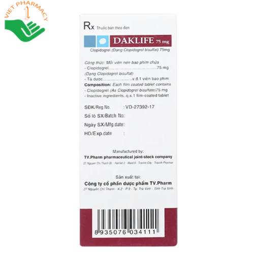 Công dụng thuốc Daklife 75mg phòng ngừa xơ vữa động mạch