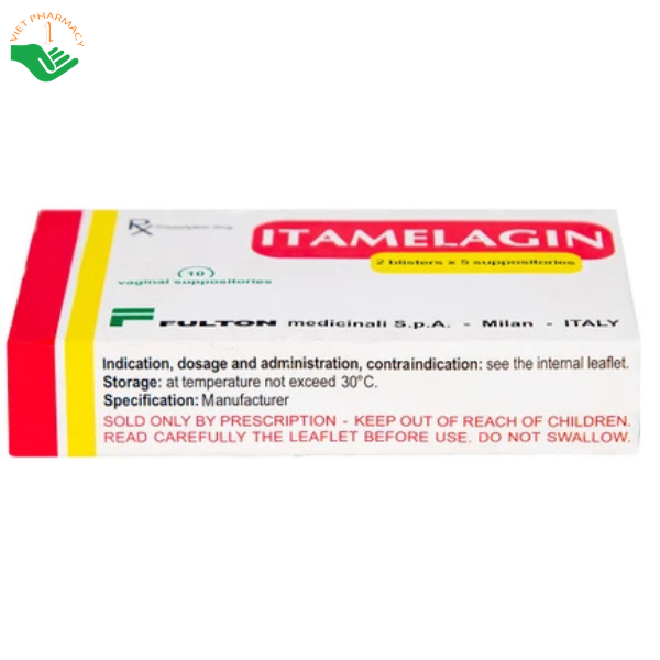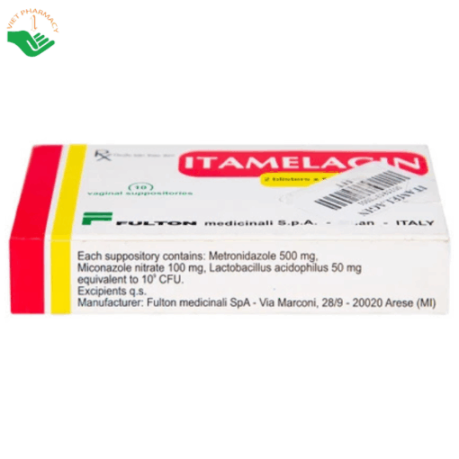 Itamelagin 500mg là thuốc đặt âm đạo phối hợp giữa metronidazole, miconazole và Lactobacillus acidophilus, có tác dụng điều trị hiệu quả viêm âm đạo do nấm Candida, Trichomonas và bội nhiễm vi khuẩn Gram dương, Gram âm. Metronidazole giúp tiêu diệt vi khuẩn kỵ khí và động vật nguyên sinh gây viêm nhiễm phụ khoa, trong khi miconazole có phổ kháng nấm rộng, ức chế sự phát triển của nhiều chủng nấm gây bệnh tại âm đạo. Lactobacillus acidophilus hỗ trợ phục hồi và duy trì hệ vi khuẩn có lợi, giúp cân bằng môi trường sinh lý âm đạo. Thuốc được dùng bằng đường đặt âm đạo, mỗi ngày 1 viên, thường vào buổi tối, trong thời gian 2 tuần theo chỉ định của bác sĩ. Itamelagin giúp giảm nhanh các triệu chứng như ngứa, rát, khí hư bất thường và hạn chế tái phát viêm nhiễm. Thuốc tương đối an toàn khi dùng đúng cách, tác dụng phụ chủ yếu là kích ứng nhẹ tại chỗ. Sản phẩm được sản xuất tại Ý, phù hợp sử dụng trong điều trị các bệnh viêm nhiễm phụ khoa thường gặp.