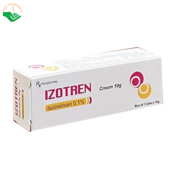 Izotren 0,1% chứa Isotretinoin 10mg, là thuốc bôi ngoài da giúp giảm tiết dầu nhờn bằng cách ức chế hoạt động của tuyến bã nhờn, từ đó hỗ trợ ngăn ngừa và điều trị mụn trứng cá. Sản phẩm phù hợp cho bệnh nhân bị mụn trứng cá mức độ nhẹ đến trung bình, bao gồm cả mụn viêm và không viêm. Thuốc được sử dụng với liều 1–2 lần mỗi ngày, cần kiên trì dùng liên tục trong khoảng 6–8 tuần hoặc lâu hơn tùy tình trạng da để đạt hiệu quả tối ưu. Trong quá trình sử dụng, có thể gặp một số tác dụng không mong muốn nhẹ như châm chích, đỏ da hoặc bong tróc, thường sẽ hết khi ngừng thuốc. Izotren 0,1% không dùng cho phụ nữ mang thai, đang cho con bú hoặc người mẫn cảm với thành phần của thuốc. Khi dùng cần tránh vùng da nhạy cảm, vết thương hở và bảo vệ da khỏi ánh nắng mặt trời. Sản phẩm được sản xuất bởi Công ty Cổ phần Dược phẩm Nam Hà và bảo quản nơi khô mát, dưới 30°C.