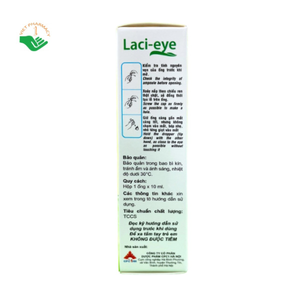Dung dịch nhỏ mắt, không màu đến hơi vàng nhẹ, trong đến hơi đục, không có tiểu phân lạ.