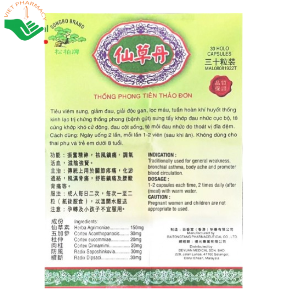 Thống Phong Tiên Thảo Đơn là sản phẩm hỗ trợ điều trị được bào chế từ nhiều dược liệu quý trong y học cổ truyền như Tiên Hạc Thảo, Ngũ Gia Bì, Đương Quy, Đảng Sâm, Độc Hoạt, Tục Đoạn… Sự kết hợp hài hòa giữa các vị thuốc này giúp mang lại tác dụng giảm đau, tiêu viêm, tăng tuần hoàn khí huyết, hỗ trợ lọc máu, thông kinh lạc và giải độc gan. Sản phẩm được chỉ định trong các trường hợp đau nhức xương khớp, tê bì tay chân, viêm sưng khớp, giúp cải thiện vận động và nâng cao sức khỏe tổng thể. Với dạng viên nén tiện dụng, Thống Phong Tiên Thảo Đơn dễ dàng sử dụng và hấp thu, phù hợp cho những người cần hỗ trợ điều trị lâu dài.
