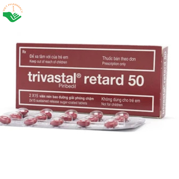 Thuốc Trivastal Retard 50mg chứa hoạt chất piribedil 50mg, là thuốc chủ vận dopamine được dùng chủ yếu trong điều trị bệnh Parkinson, đặc biệt các trường hợp có triệu chứng run nổi trội. Thuốc có thể dùng đơn trị liệu hoặc phối hợp với levodopa, giúp cải thiện các rối loạn vận động bằng cách kích thích các thụ thể dopamine trong não. Dạng viên phóng thích chậm giúp duy trì hiệu quả điều trị kéo dài trong 24 giờ và thuận tiện cho người bệnh khi sử dụng. Trivastal Retard được hấp thu nhanh, chuyển hóa mạnh và thải trừ chủ yếu qua thận dưới dạng chất chuyển hóa. Khi dùng thuốc cần thận trọng với các tác dụng phụ như buồn ngủ, chóng mặt, hạ huyết áp và chỉ sử dụng theo chỉ định của bác sĩ.