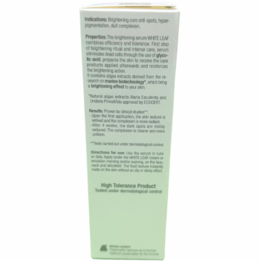 Không chỉ tập trung vào hiệu quả làm sáng, White Leaf Brightening Serum còn hỗ trợ làm mờ các đốm nâu, vết thâm và vùng da sạm màu, giúp tổng thể làn da trông đều màu và mịn màng hơn. Sản phẩm có thể sử dụng trong các liệu trình dưỡng da chuyên sâu hoặc dùng hằng ngày để duy trì làn da sáng khỏe lâu dài. Khi kết hợp cùng kem dưỡng phù hợp, serum giúp tăng cường khả năng bảo vệ da trước các tác nhân môi trường, mang lại làn da tươi sáng tự nhiên và đầy sức sống.