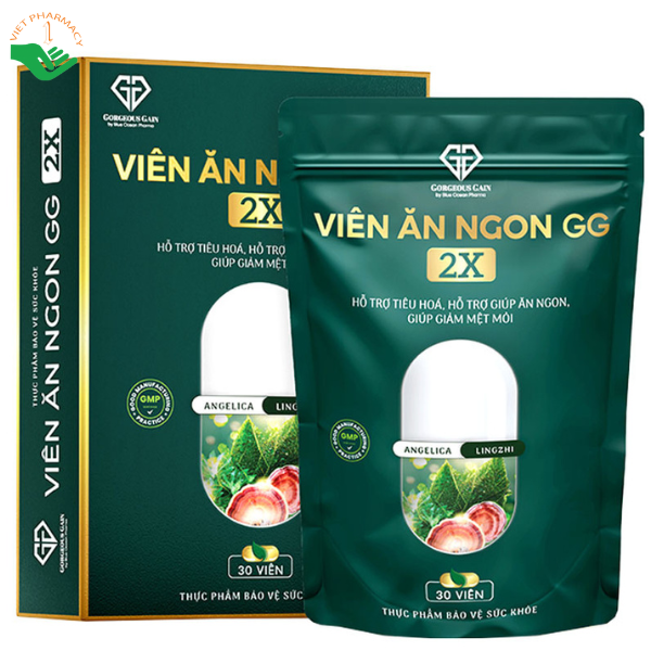 - Viên ăn ngon GG 2X là thực phẩm bảo vệ sức khỏe được nghiên cứu và phát triển với mục tiêu hỗ trợ hệ tiêu hóa, giúp ăn ngon miệng hơn và góp phần giảm cảm giác mệt mỏi do hấp thu dinh dưỡng kém. Sản phẩm không phải là thuốc điều trị bệnh mà đóng vai trò hỗ trợ cải thiện chức năng tiêu hóa, từ đó giúp cơ thể hấp thu dưỡng chất tốt hơn và duy trì thể trạng ổn định.