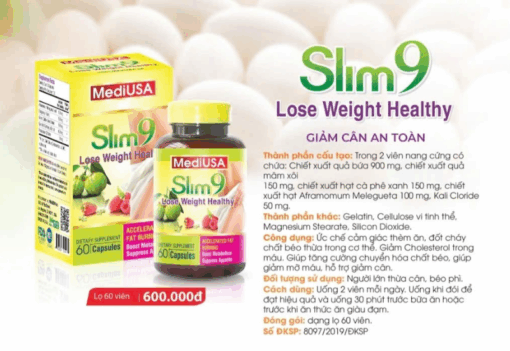 Với công nghệ sản xuất hiện đại, Slim 9 có nguồn gốc xuất xứ từ Mỹ được nhập khẩu và phân phối bởi công ty TNHH MediUSA và bán chính hãng tại Nhà Thuốc Việt. Đây là dòng sản phẩm giảm cân đang được người tiêu dùng tin tưởng lựa chọn thời gian gần đây.
