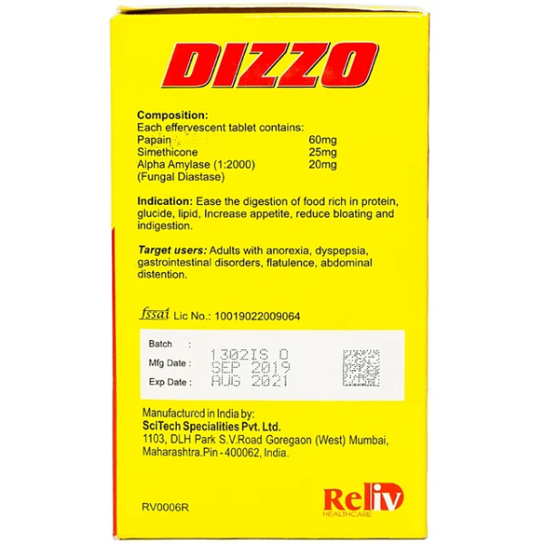 - Viên sủi Dizzo là giải pháp hỗ trợ sức khỏe đường ruột hiệu quả, được thiết kế đặc biệt để thúc đẩy quá trình tiêu hóa và tăng cường khả năng hấp thụ dưỡng chất từ thực phẩm. Sản phẩm là sự kết hợp của các enzyme tiêu hóa thiết yếu và hoạt chất giảm đầy hơi: