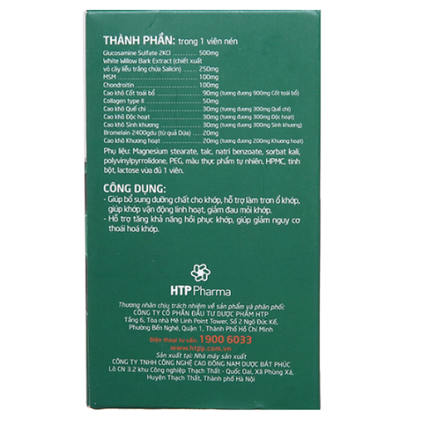 Glucosamine Sulfate 2KCI 500mg, White Willow Bark Extract chiết xuất vỏ cây liễu trắng chứa Salicin) 250mg, MSM 100mg, Chondroitin 100mg, Cao khô Cốt toái bổ 90mg (tương đương 900mg cốt toái bổ), Collagen type II 50mg, Cao khô Quế chi 30mg (tương đương 300mg Quế chi), Cao khô Độc hoạt 30mg (tương đương 300mg Độc hoạt), Cao khô Sinh khương 30mg (tương đương 300mg Sinh khương), Bromelain 2400gdu (từ quả Dứa) 20mg, Cao khô Khương hoạt 20mg (tương đương 200mg Khương hoạt).