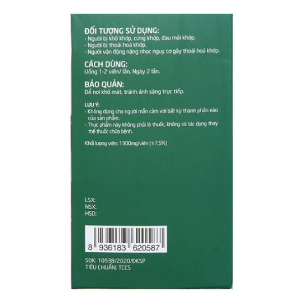Giúp bổ sung dưỡng chất cho khớp, hỗ trợ làm trơn ổ khớp, giúp khớp vận động linh hoạt, giảm đau mỏi khớp. Hỗ trợ tăng khả năng hồi phục khớp, giúp giảm nguy cơ thoái hoá khớp.