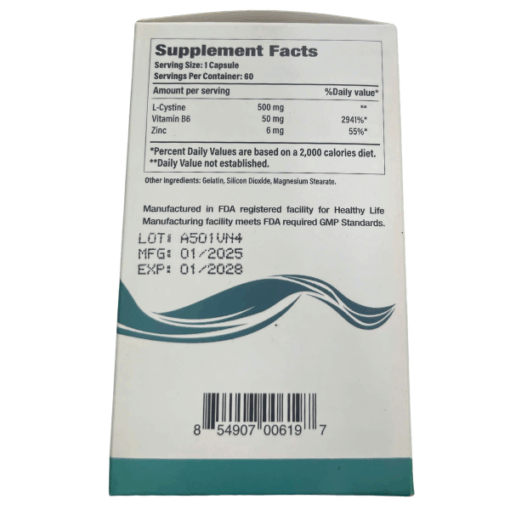 - L-Cystine: 500mg, Vitamin B6: 50mg, Zinc: 6mg