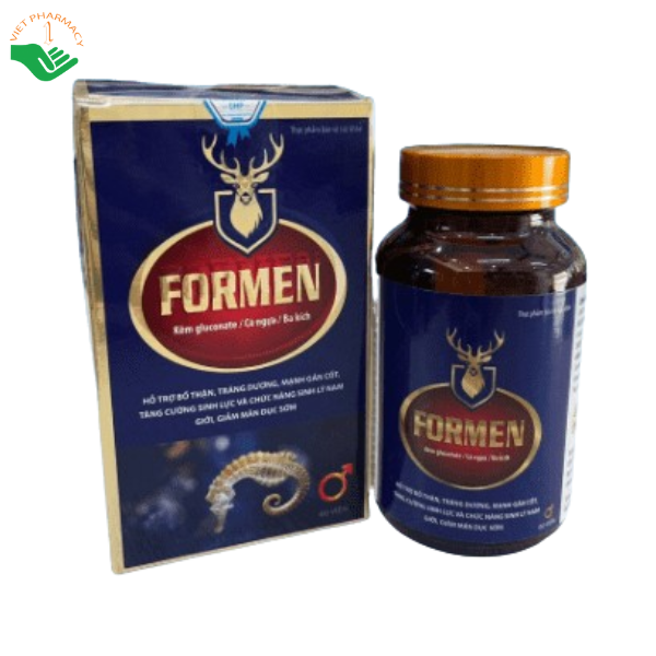 Formen là thực phẩm bảo vệ sức khỏe dành cho nam giới với công thức kết hợp nhiều dược liệu quý và vi chất cần thiết. Sản phẩm chứa Nhục thung dung, Ba kích, Dâm dương hoắc, Nhân sâm, Lộc nhung, Đông trùng hạ thảo cùng L-Arginine và kẽm. Formen hỗ trợ bổ thận, tráng dương, mạnh gân cốt và tăng cường sinh lực nam giới. Sản phẩm giúp cải thiện tình trạng suy giảm sinh lý, mệt mỏi, suy nhược cơ thể. Đồng thời hỗ trợ giảm mãn dục sớm và nâng cao phong độ phái mạnh. Formen góp phần hỗ trợ tăng cường testosterone nội sinh một cách tự nhiên. Phù hợp sử dụng hàng ngày để duy trì sức khỏe sinh lý và thể lực nam giới.