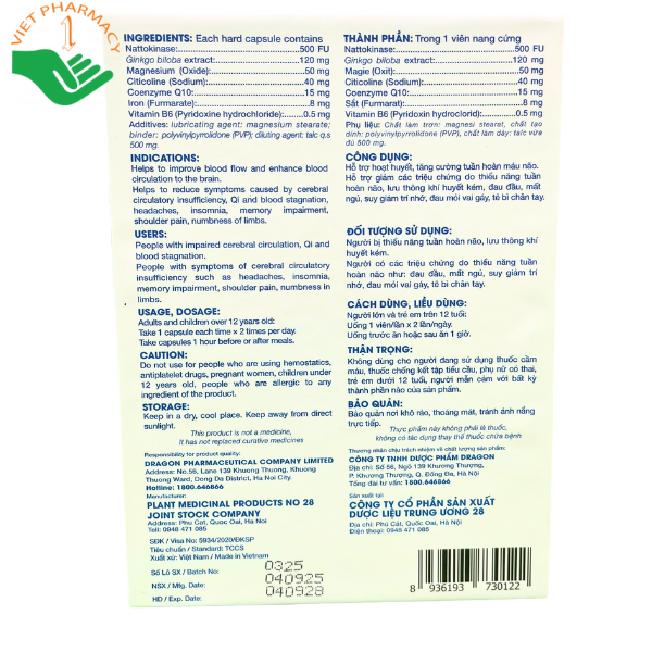- Hỗ trợ giảm các triệu chứng do thiểu năng tuần hoàn não, khí huyết ứ trệ gây ra như: đau đầu, mất ngủ, suy giảm trí nhớ, đau mỏi vai gáy, tê bì chân tay.