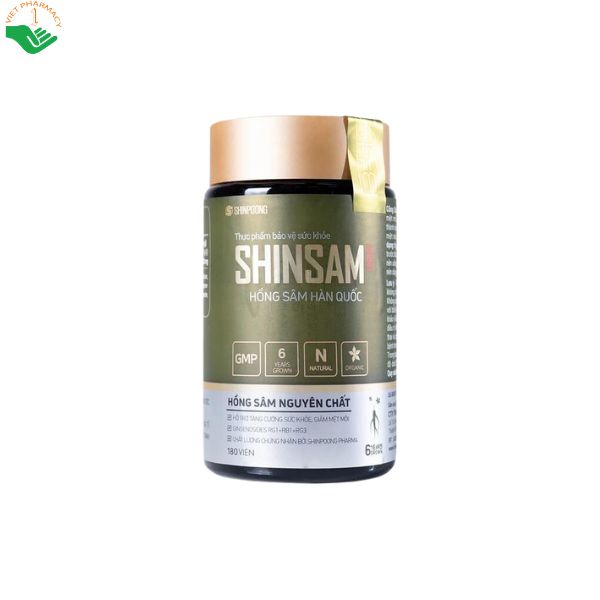 Viên uống Hồng Sâm Hàn Quốc 6 Năm Tuổi SHINSAM chứa đến 500mg bột hồng sâm nguyên chất được kiểm soát nghiêm ngặt bởi các tiêu chuẩn GMP, GLP, GSP và GDP. Chứng nhận bởi Dược Phẩm Shinpoong Daewoo bởi các tiêu chuẩn GMP, GLP, GSP và GDP. Chứng nhận bởi Dược Phẩm Shinpoong Daewoo.