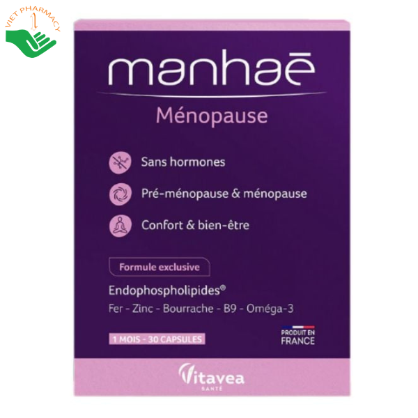 Manhaé không phải là thuốc, mà là thực phẩm chức năng/viên uống bổ sung được sản xuất tại Pháp bởi Laboratoires Nutrisanté. Sản phẩm hỗ trợ cân bằng nội tiết tố và sức khỏe phụ nữ, đặc biệt ở giai đoạn tiền mãn kinh và mãn kinh, không thay thế thuốc chữa bệnh.