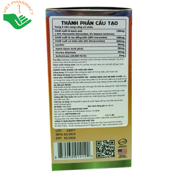 - Chiết xuất lá bạch quả (24% Flavonoids Glycosides, 6% Terpene Lactones): 120mg