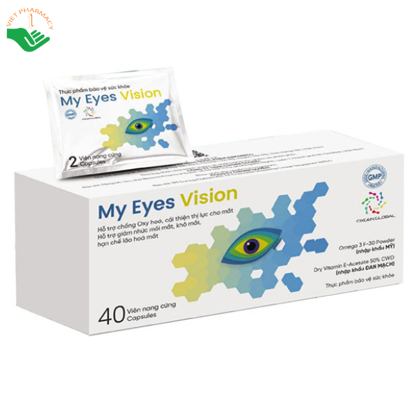 My Eyes Vision là thực phẩm bảo vệ sức khỏe được nghiên cứu và phát triển nhằm hỗ trợ chăm sóc toàn diện cho đôi mắt. Sản phẩm kết hợp nhiều chiết xuất thảo dược cùng các vi chất thiết yếu như lutein, zeaxanthin, vitamin và khoáng chất, giúp giảm nhức mỏi mắt, khô mắt, đồng thời hỗ trợ chống oxy hóa và hạn chế lão hóa mắt.