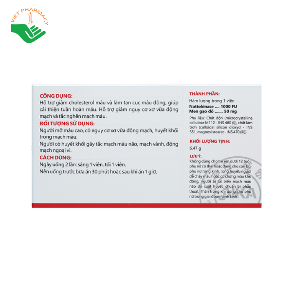 - Hàm lượng trong 1 viên Nattokinase 1000 FU, Men gạo đỏ 50 mg.