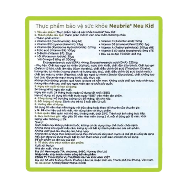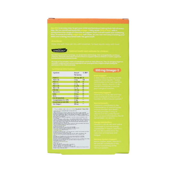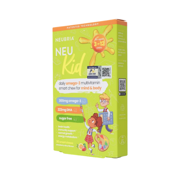 Giai đoạn từ 3 đến 12 tuổi là “cửa sổ vàng” để phát triển trí tuệ và thể chất toàn diện. Neu Kid Multivitamin Plus Omega-3 từ thương hiệu Neubria (Vương quốc Anh) mang đến giải pháp bổ sung đơn giản nhưng toàn diện cho bé yêu. Công thức đặc biệt tích hợp DHA và EPA từ Omega-3 cùng các nhóm vitamin A, C, D3, E và khoáng chất thiết yếu, đáp ứng nhu cầu dinh dưỡng đa chiều. Neu Kid Multivitamin Plus Omega-3 đặc biệt phù hợp với trẻ biếng ăn hoặc hấp thu kém, giúp bổ sung đầy đủ vi chất mà chế độ ăn thường ngày khó đáp ứng đủ trong giai đoạn tăng trưởng nhanh.