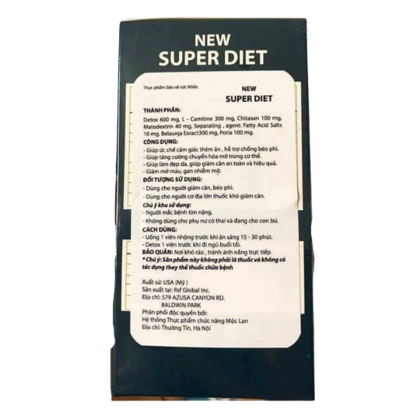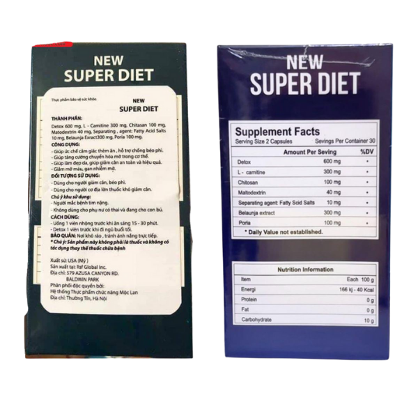 New Super Diet sử dụng công thức kết hợp L-Carnitine, Detox, Chitosan cùng chiết xuất Belaunja và Poria giúp giảm mỡ, hỗ trợ chuyển hóa và hạn chế cảm giác thèm ăn. Nhờ sự kết hợp giữa hoạt chất chuyển hóa năng lượng và thảo dược thanh lọc, sản phẩm hỗ trợ giảm cân theo hướng tự nhiên, không gây mệt mỏi nếu dùng đúng hướng dẫn. Tuy nhiên mức độ cải thiện vẫn phụ thuộc vào chế độ dinh dưỡng và mức độ vận động của mỗi người.