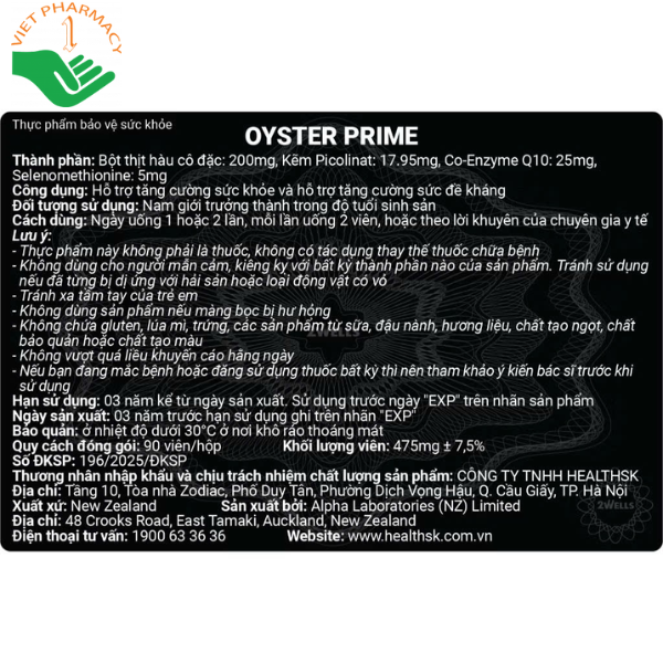 Mỗi viên uống là sự chắt lọc từ nguyên liệu chọn lọc, sản xuất theo quy trình đạt chuẩn quốc tế, không chứa gluten, đậu nành, hương liệu hay chất bảo quản. Sản phẩm an toàn, dễ sử dụng và thích hợp cho nam giới trong độ tuổi sinh sản mong muốn chăm sóc sức khỏe lâu dài. Hãy để Oyster Prime trở thành người bạn đồng hành tin cậy, giúp bạn duy trì phong độ, bản lĩnh và sự mạnh mẽ trong cuộc sống.