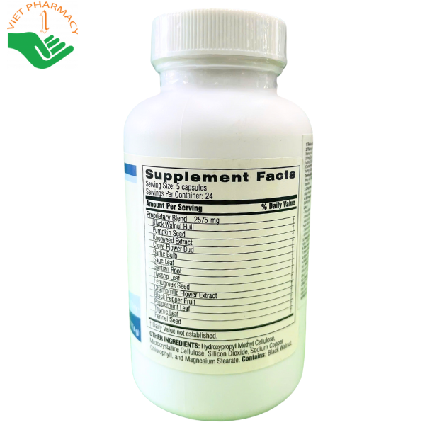 Hạt bí ngô (Pumpkin Seed), vỏ cây óc chó màu đen (Black – Walnut Hull), Chiết xuất Hà Thủ Ô đỏ (Knotweed Extract), Tỏi (Garlic Bulb), Nụ Đinh Hương (Clove Flower Bud), Lá cây xô thơm (Sage Leaf), Rể cây long đờm (Gentian Root), Lá cây bài hương (Hyssop Leaf), Hạt cây cỏ Cà Ri (Fenugreek Seed), Chiết xuất hoa cúc La Mã (Chamomile Flower Extract), Hạt tiêu đen (Black Pepper Fruit). Lá Bạc Hà (Peooermint Leaf), Cỏ xa hương.