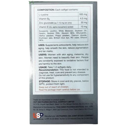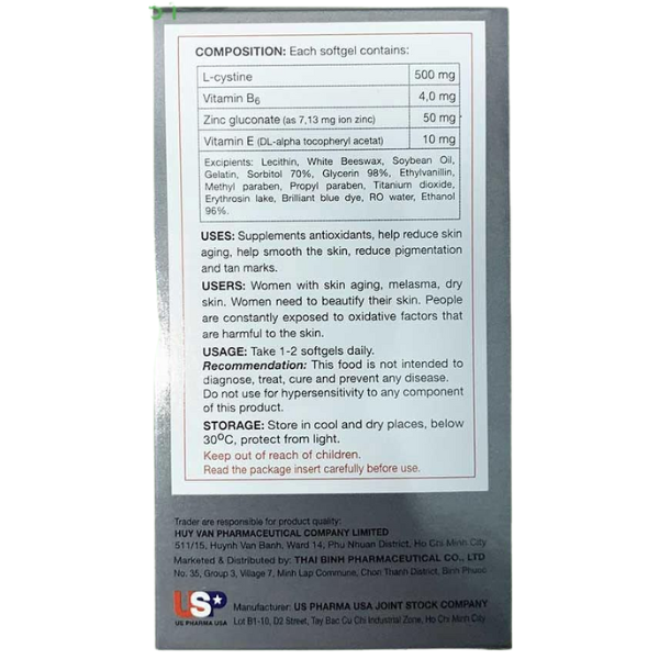 Tá dược: Dầu đậu nành, Dầu cọ, Sáp ong trắng, Gelatin, Glycerin 98%, Sorbitol, Ethyl vanillin, Titan dioxyd, Ethanol 96%, nước tinh khiết.