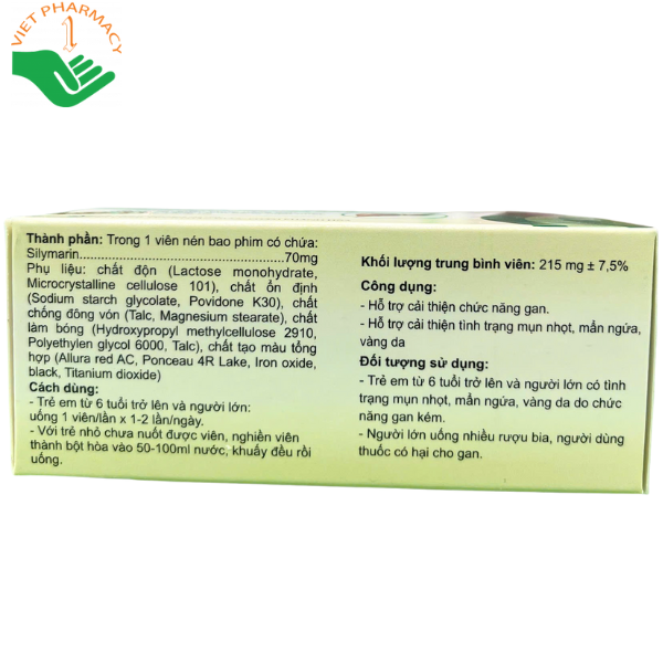 Trong 1 viên nén bao phim có chứa: Silymarin……………………………………………………………….70mg