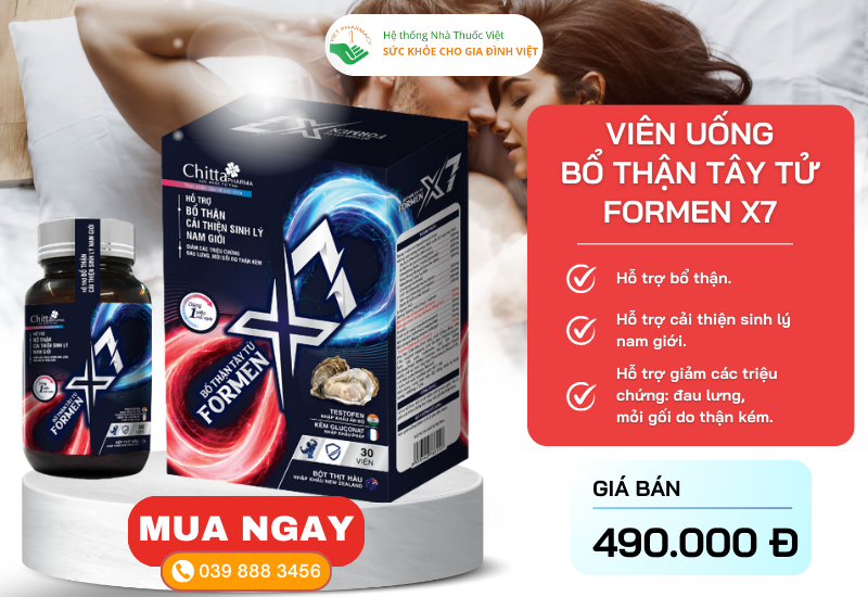 Đồng thời, Bổ thận Tây Tử Formen X7 còn giúp hỗ trợ làm giảm các biểu hiện thường gặp do thận kém như đau lưng, mỏi gối, cũng như hỗ trợ cải thiện tình trạng tiểu đêm, giúp nam giới lấy lại sự thoải mái và tự tin trong sinh hoạt hằng ngày. Bổ thận Tây Tử Formen X7 là sản phẩm có số đăng ký rõ ràng và được cấp phép lưu hành tại Việt Nam, giúp các quý ông yên tâm tuyệt đối trong quá trình sử dụng. Xem thông tin và đặt mua dưới đây: