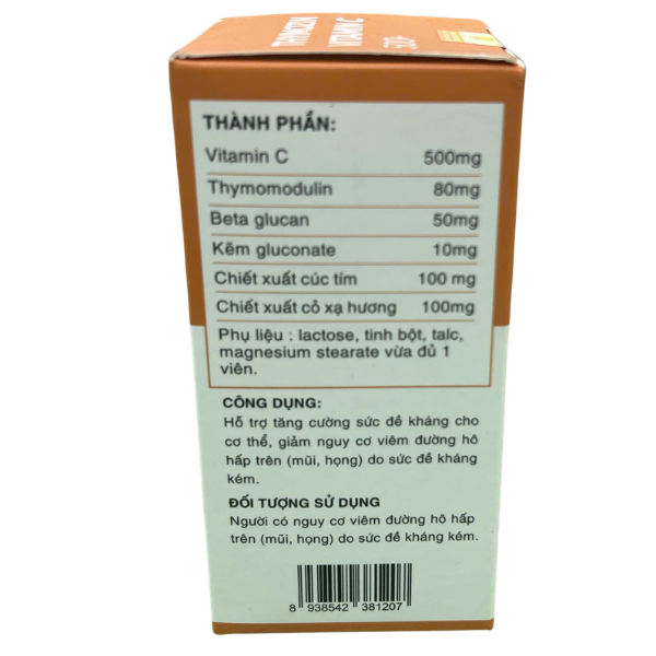 Không dừng lại ở việc bổ sung dinh dưỡng, Thymozin Vitamin C 500+ còn hướng đến việc cải thiện sức khỏe lâu dài, giúp giảm nguy cơ viêm đường hô hấp trên như viêm họng, sổ mũi, cảm cúm do đề kháng kém. Với công thức tiện lợi, dễ sử dụng mỗi ngày, sản phẩm phù hợp cho cả trẻ em và người lớn, đặc biệt là những người thường xuyên tiếp xúc môi trường ô nhiễm, dễ ốm vặt hoặc đang trong giai đoạn cần phục hồi thể trạng. Đây là lựa chọn lý tưởng để chủ động bảo vệ sức khỏe cho cả gia đình.