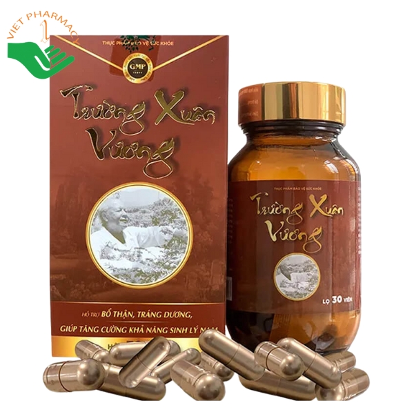 Viên uống Trường Xuân Vương là thực phẩm bảo vệ sức khỏe, hỗ trợ tăng cường khả năng sinh lý và cải thiện phong độ cho nam giới. Sản phẩm có nguồn gốc từ y học cổ truyền, kết hợp các thảo dược quý giúp hỗ trợ nâng cao sinh lực và cải thiện đời sống sinh lý. Dạng viên nang tiện lợi, phù hợp với nam giới gặp tình trạng suy giảm sinh lý do tuổi tác hoặc áp lực cuộc sống. Trường Xuân Vương còn giúp bồi bổ cơ thể, tăng sức bền và sự dẻo dai, hỗ trợ cải thiện các biểu hiện như sinh lý yếu, xuất tinh sớm khi sử dụng đúng cách.
