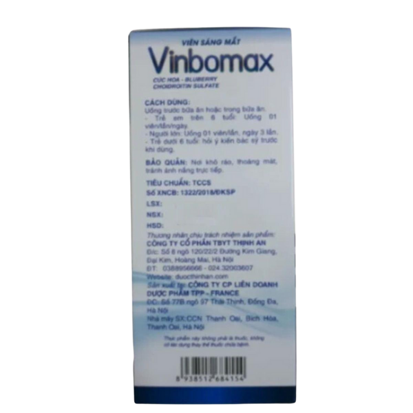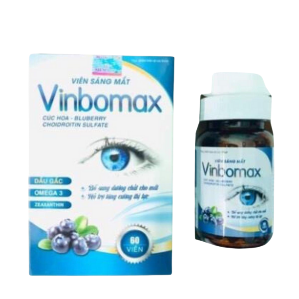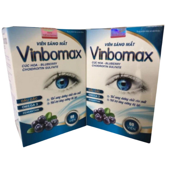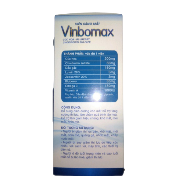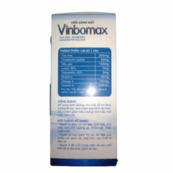 Vinbomax là viên uống hỗ trợ thị lực, giúp làm chậm thoái hóa điểm vàng, giảm khô mỏi mắt và cải thiện khả năng nhìn. Sản phẩm kết hợp các thành phần thiên nhiên và dưỡng chất như Cúc hoa, Chondroitin, Dầu gấc, Lutein, Zeaxanthin, Blueberry, Omega-3 và Vitamin A, giúp bảo vệ mắt trước ánh sáng xanh và căng thẳng thị giác. Với dạng viên nang mềm dễ sử dụng, Vinbomax phù hợp cho người lớn, người trung niên và trẻ em trên 6 tuổi thường xuyên dùng thiết bị điện tử hoặc phải làm việc, học tập trong thời gian dài.