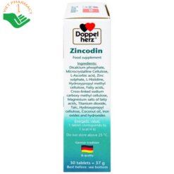 Viên uống Zincodin Doppelherz Aktiv được nhập khẩu từ Đức, là sự kết hợp khoa học giữa kẽm, vitamin C và L-histidine, mang đến giải pháp hỗ trợ tăng cường sức đề kháng và duy trì sức khỏe tổng thể. Kẽm là khoáng chất thiết yếu, đóng vai trò quan trọng trong việc bảo vệ hệ miễn dịch, hỗ trợ quá trình trao đổi chất và duy trì làn da, mái tóc, móng khỏe mạnh. Kết hợp cùng vitamin C – chất chống oxy hóa tự nhiên và L-histidine – một loại axit amin cần thiết, sản phẩm giúp cơ thể hấp thu kẽm hiệu quả hơn, đồng thời tăng cường khả năng bảo vệ trước các tác nhân gây hại từ môi trường.