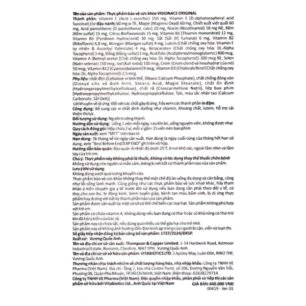Với công thức khoa học, nguồn nguyên liệu chất lượng cao và quy trình kiểm soát nghiêm ngặt theo tiêu chuẩn quốc tế, Visionace Original là lựa chọn đáng tin cậy cho những ai mong muốn chăm sóc đôi mắt khỏe mạnh lâu dài, đồng thời nâng cao chất lượng cuộc sống mỗi ngày.