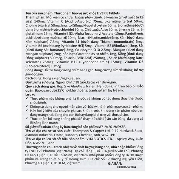 - Sản phẩm thực phẩm bảo vệ sức khỏe LIVERIL Tablets không phải là thuốc và không có tác dụng thay thế thuốc chữa bệnh.