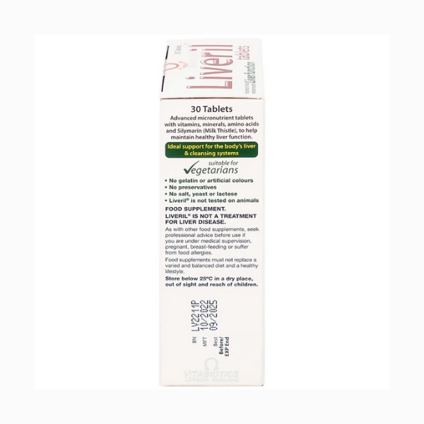 Viên uống Vitabiotics Liveril là thực phẩm bảo vệ sức khỏe giúp hỗ trợ tăng cường chức năng gan và bảo vệ tế bào gan trước các tác nhân gây hại từ môi trường và lối sống hiện đại. Sản phẩm được nghiên cứu và sản xuất bởi Vitabiotics – thương hiệu chăm sóc sức khỏe uy tín đến từ Anh Quốc, với công thức phối hợp khoa học giữa các hoạt chất nguồn gốc tự nhiên, acid amin, vitamin và khoáng chất thiết yếu cho gan.