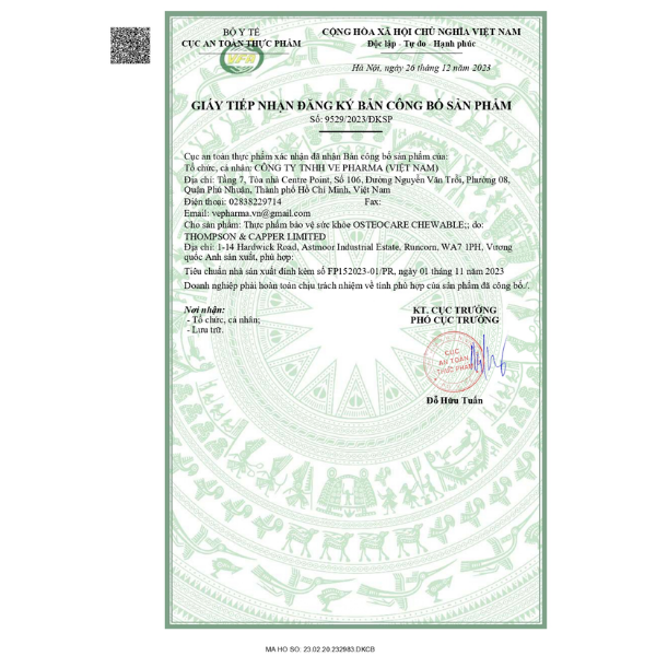 - Giấy tiếp nhận đăng ký bản công bố sản phẩm: 9529/2023/ĐKSP