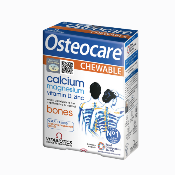 Thực phẩm bảo vệ sức khỏe Vitabiotics Osteocare Chewable là sản phẩm bổ sung canxi dạng viên nhai tiện lợi, mang đến giải pháp lý tưởng cho trẻ em và những người gặp khó khăn trong việc sử dụng dạng viên nén thông thường. Sản phẩm chứa Canxi phối hợp với các vi chất hỗ trợ như: Vitamin D3 – Magie – Kẽm – Đồng – Mangan – Boron – Selen, hỗ trợ duy trì xương chắc khỏe, đồng thời còn hỗ trợ chức năng cơ và hệ thần kinh.