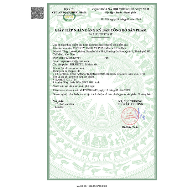 - Giấy tiếp nhận đăng ký bản công bố sản phẩm: 9185/2019/ĐKSP
