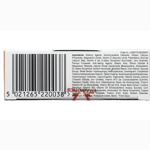 Thành phần khác: Microcrystalline Cellulose, Dibasic Calcium Phosphate, Stearic Acid, Silicon Dioxide, Magiê Stearate, Natri Ascorbate, Tinh bột biến tính, Tinh bột ngô, Glucose Syrup, Hydroxypropyl Methylcellulose, Crosslinked Carboxymethylcellulose Sodium, Hydroxypropyl Cellulose, Capric/Caprillic Triglyceride, Acacia, Sucrose, Medium Chain Triglycerides, Titanium Dioxide, Oxide Sắt, Trisodium Citrate, Citric Acid, Maltodextrin.