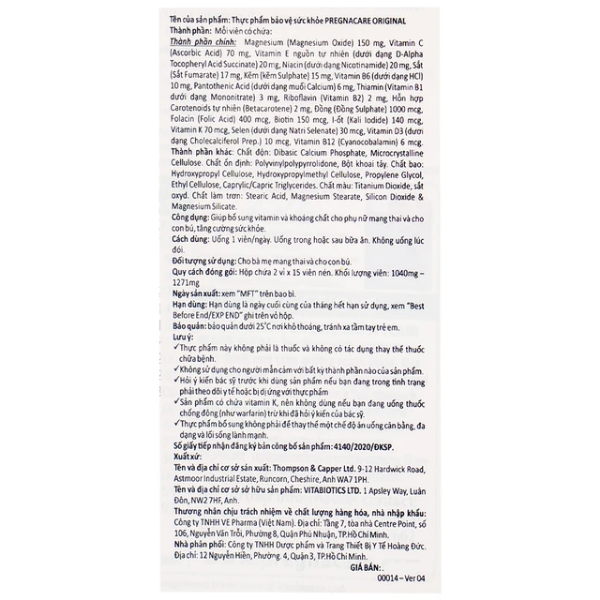 Vitabiotics Pregnacare Original được thiết kế để đồng hành cùng phụ nữ từ giai đoạn đầu mang thai cho đến khi sinh con và cả thời kỳ cho con bú. Công thức cân đối vitamin và khoáng chất giúp đáp ứng nhu cầu dinh dưỡng tăng cao của cơ thể mẹ trong suốt các giai đoạn này, hỗ trợ sức khỏe tổng thể và giúp mẹ yên tâm hơn trong thai kỳ.