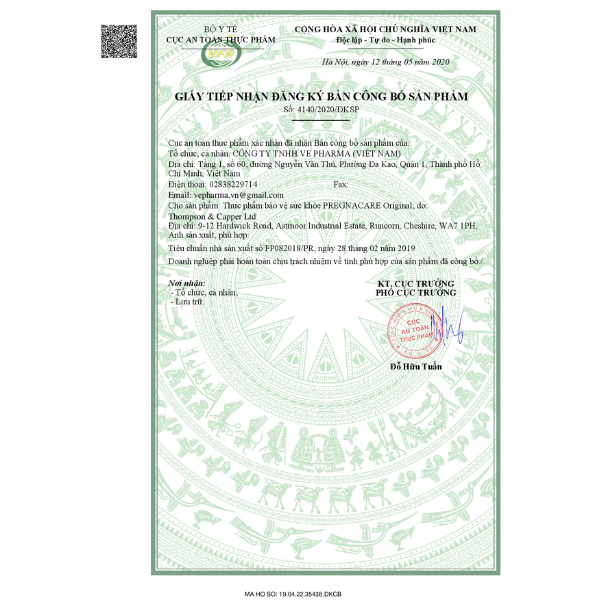 - Giấy tiếp nhận đăng ký bản công bố sản phẩm: 4140/2020/ĐKSP