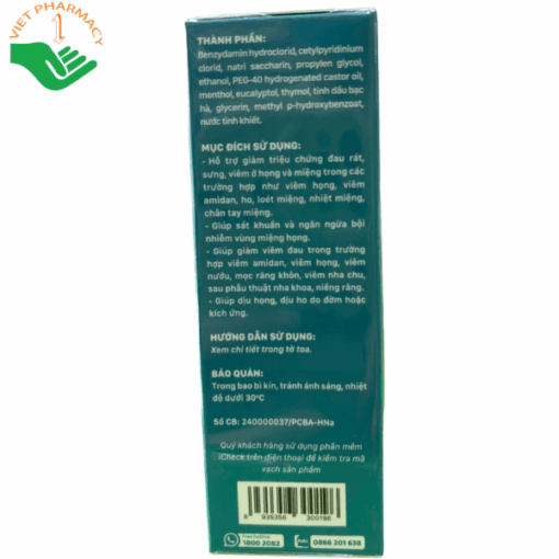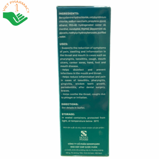 - Hỗ trợ làm giảm các triệu chứng đau, sưng và viêm ở vùng họng và miệng, áp dụng trong các trường hợp như viêm họng, viêm amidan, ho, loét miệng, nhiệt miệng, và bệnh tay – chân – miệng.