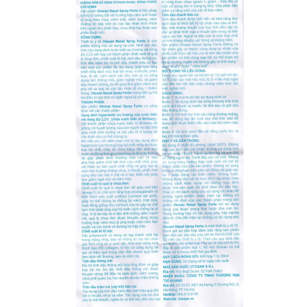 Otosan Nasal Spray Forte được thiết kế dạng chai xịt mũi 30 ml, tiện lợi, dễ sử dụng và phù hợp mang theo bên mình. Sản phẩm là thiết bị y tế đạt chuẩn châu Âu (CE), có thể dùng cho người lớn và trẻ em từ 12 tuổi, thích hợp sử dụng trong quá trình điều trị hỗ trợ cũng như chăm sóc mũi hằng ngày, đặc biệt trong môi trường ô nhiễm, nhiều khói bụi hoặc thời tiết thay đổi.