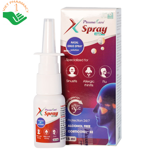 - PlasmaKare X-Spray Light giúp kháng khuẩn, kháng viêm, kháng virus tại chỗ giúp làm giảm nhanh các triệu chứng viêm nhiễm mũi xoang như nhức, nghẹt mũi, chảy mũi, viêm mũi.