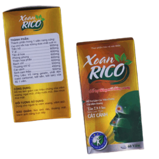 Viên uống Xoan Rico là sản phẩm thảo dược hỗ trợ giảm các triệu chứng viêm xoang như nghẹt mũi, chảy nước mũi và đau nhức vùng mũi – trán. Sản phẩm giúp làm thông thoáng đường thở, giảm viêm và hỗ trợ phục hồi khứu giác. Nhờ thành phần tự nhiên lành tính, Xoan Rico phù hợp cho người hay viêm mũi, cảm cúm và có thể dùng lâu dài để tăng cường sức khỏe hô hấp